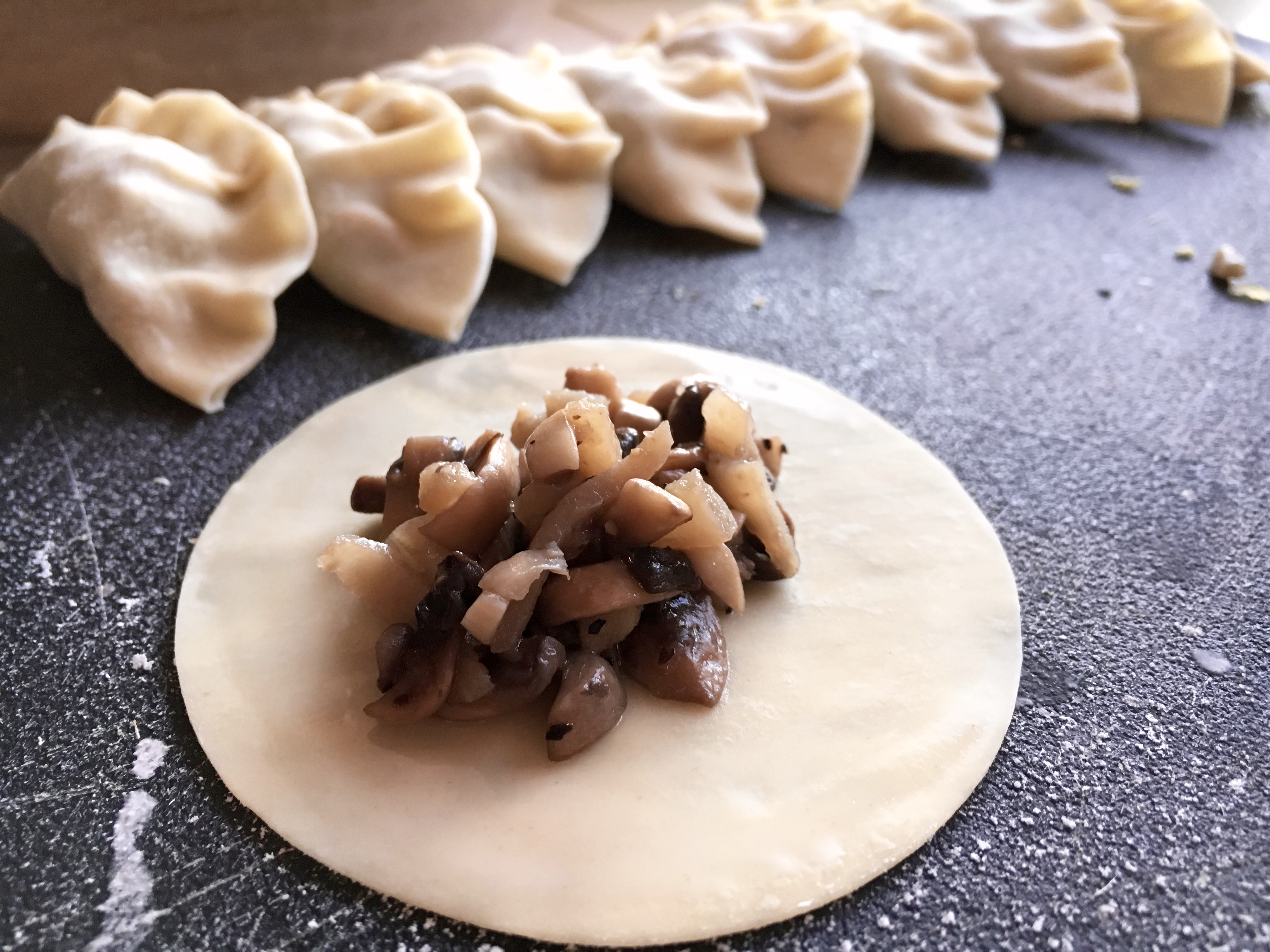 I made these using some leftover ingredients from a ramen broth I made. The end result was a filling that was perfectly savory and salty, with a little kick of spice at the end. I chose to steam these, but pan frying them to make potstickers works really well too! I just wouldn’t recommend making them in advance because the texture might get soggy.
