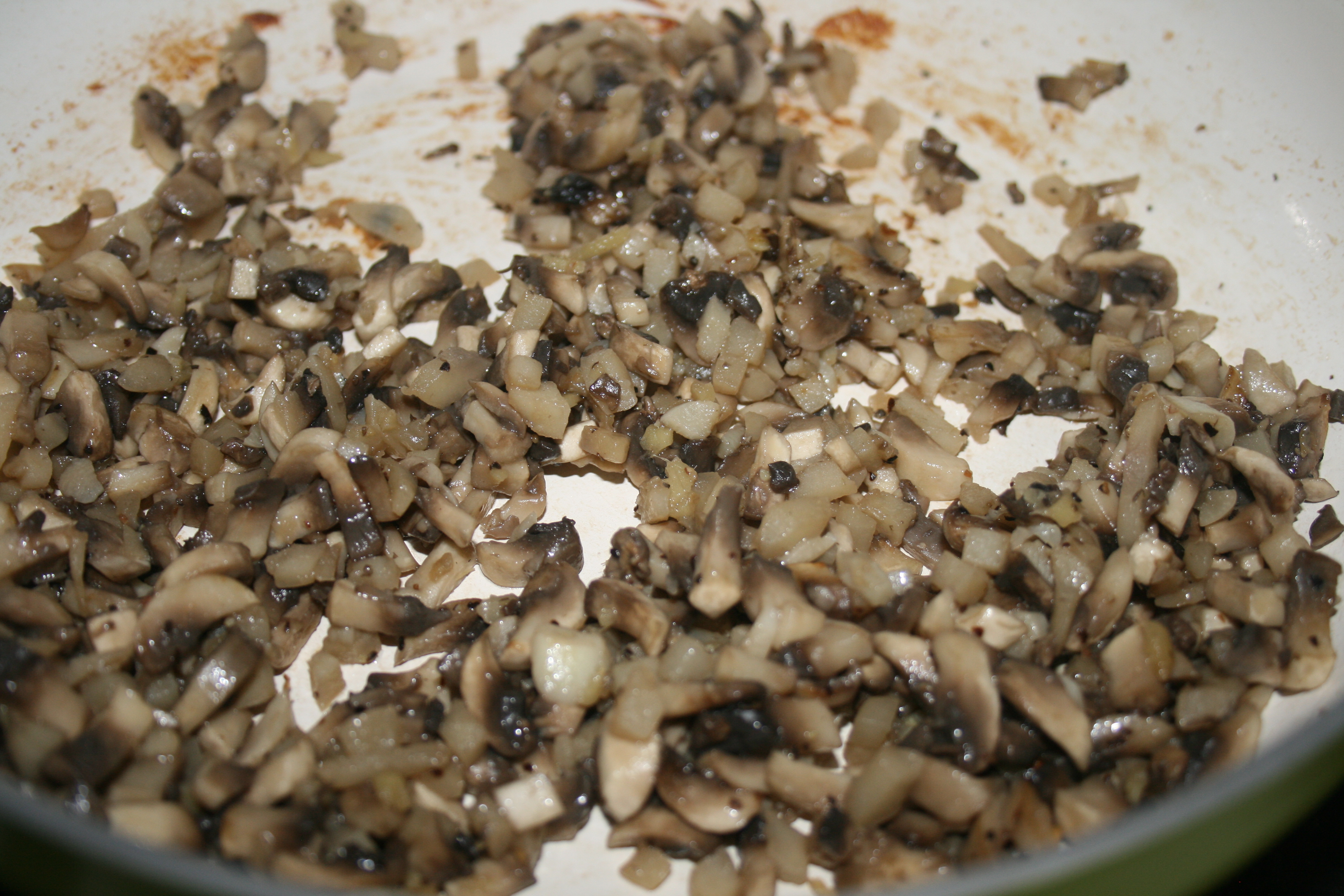 - Saute the onions, diced mushrooms, garlic, ginger, and water chestnuts until the mushrooms have released most of their liquid and it has evaporated.