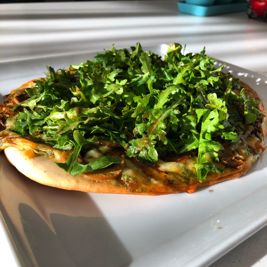 I love pizza, and this recipe is perfect for when you want to change it up from the normal red tomato sauce routine. It has a thin crust, pesto cream sauce, caramelized onions, garlic mushrooms, and topped with an arugula salad. For a quick dinner, you can use store bought pizza crust and pesto to have everything ready in less than 30 min.
