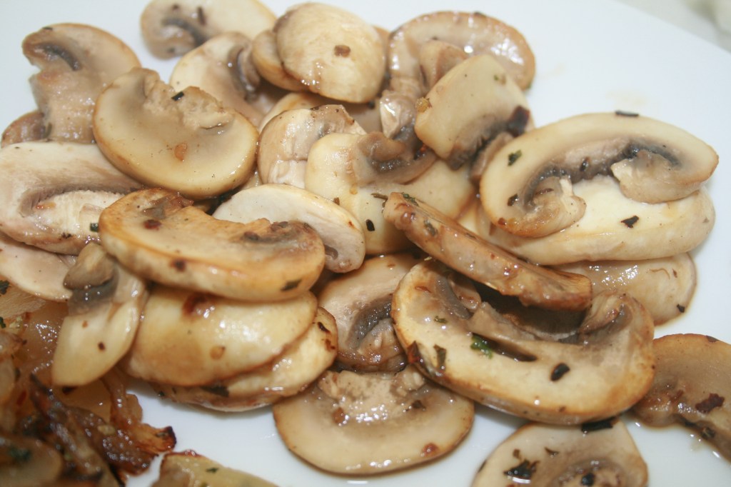 3. At this point, remove the onions from the pan, add a little olive oil, and add the sliced mushrooms. Once the mushrooms have started to brown on the edges, add garlic and salt and pepper.