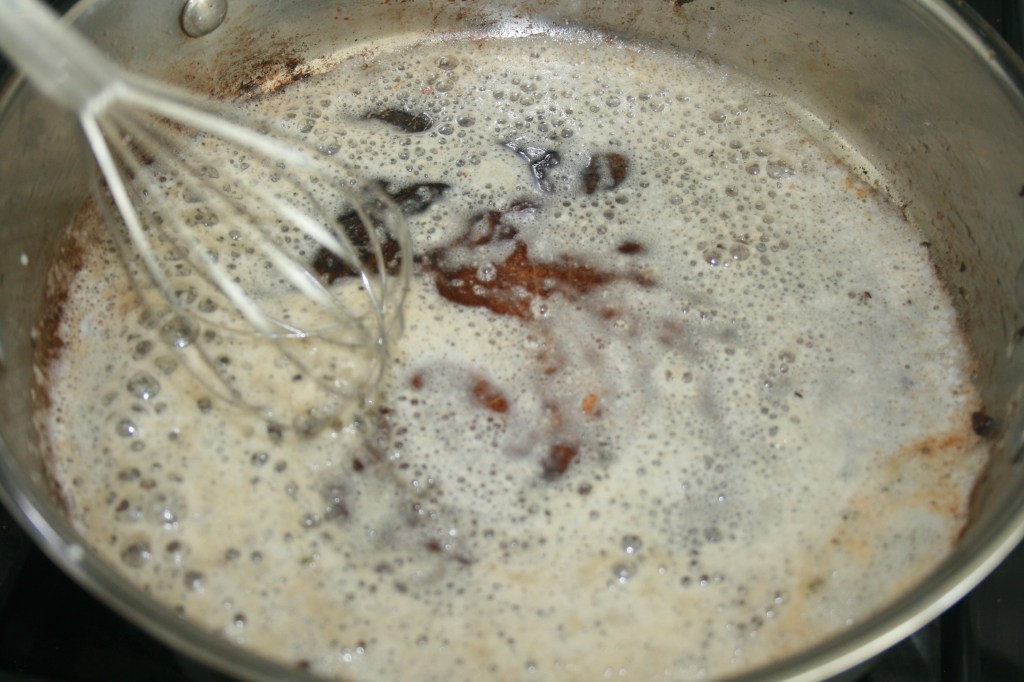 4. Remove the mushrooms from the pan, and add the butter and flour. Whisk until the flour is well incorporated into the butter, and slowly add in the milk. Continue whisking.