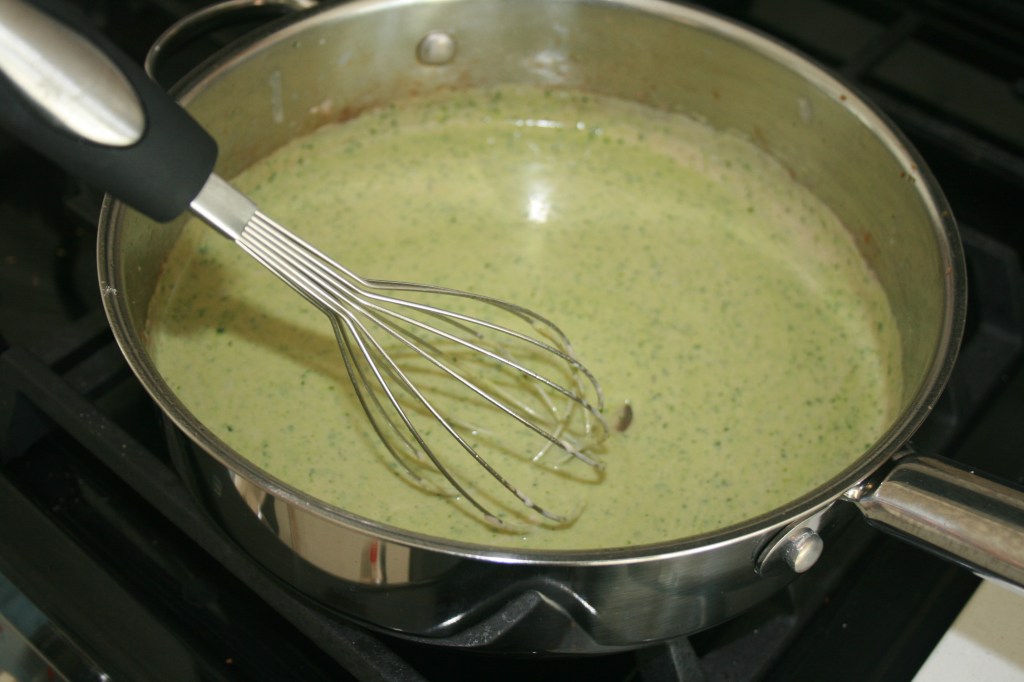 5. Keep adding milk until the sauce is the consistency of a thin alfredo sauce. The sauce will pick up all of the flavor bits from the pan from the onions and mushrooms. Turn off the heat, and spoon in 3-4 tablespoons of pesto.