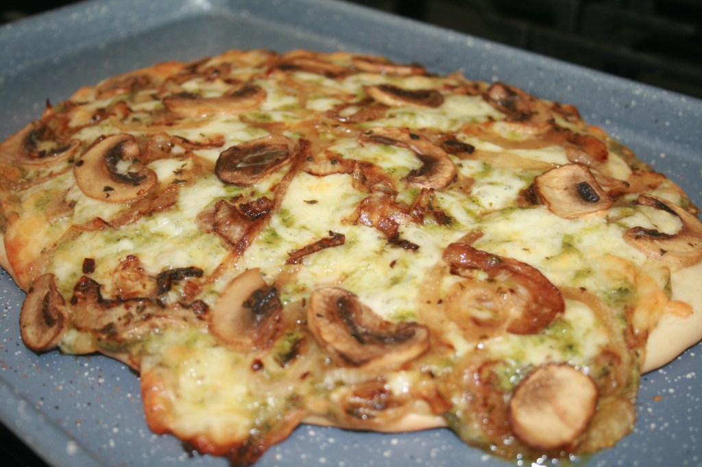 8. Place the dough on a baking sheet and top it with your sauce, cheese, caramelized onions, and mushrooms.