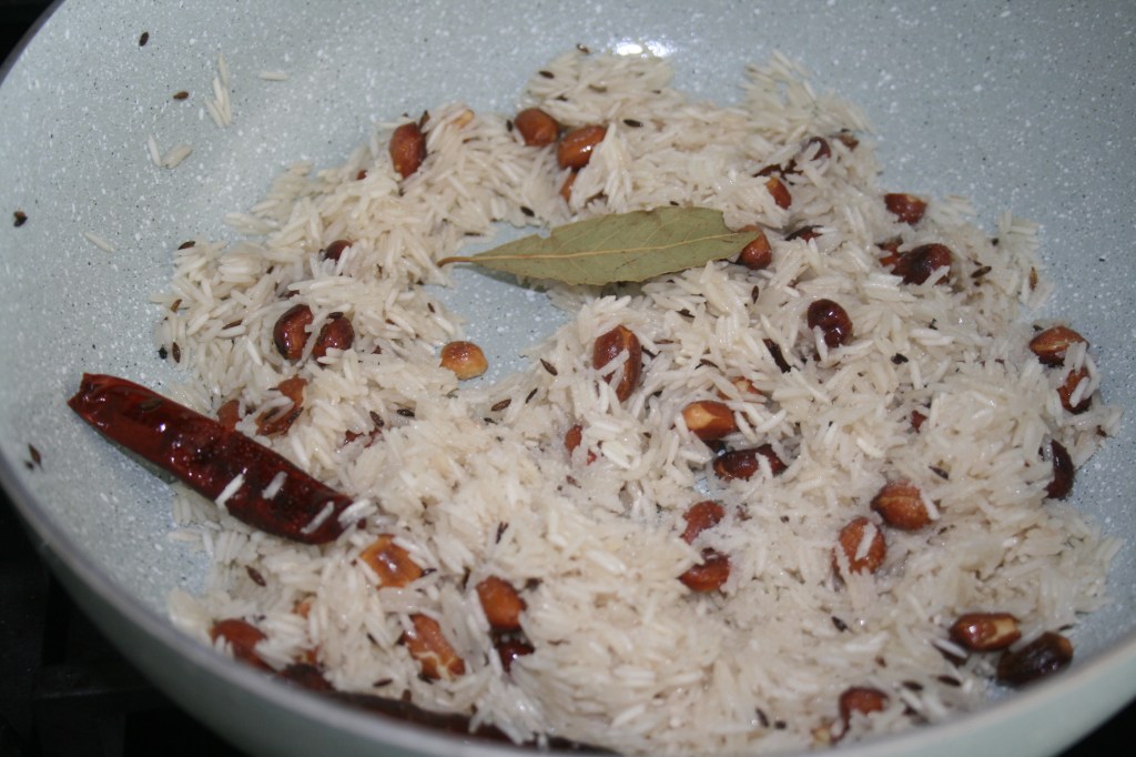 - Once the peanuts look slightly brown, add in 1 cup of rinsed basmati rice.
