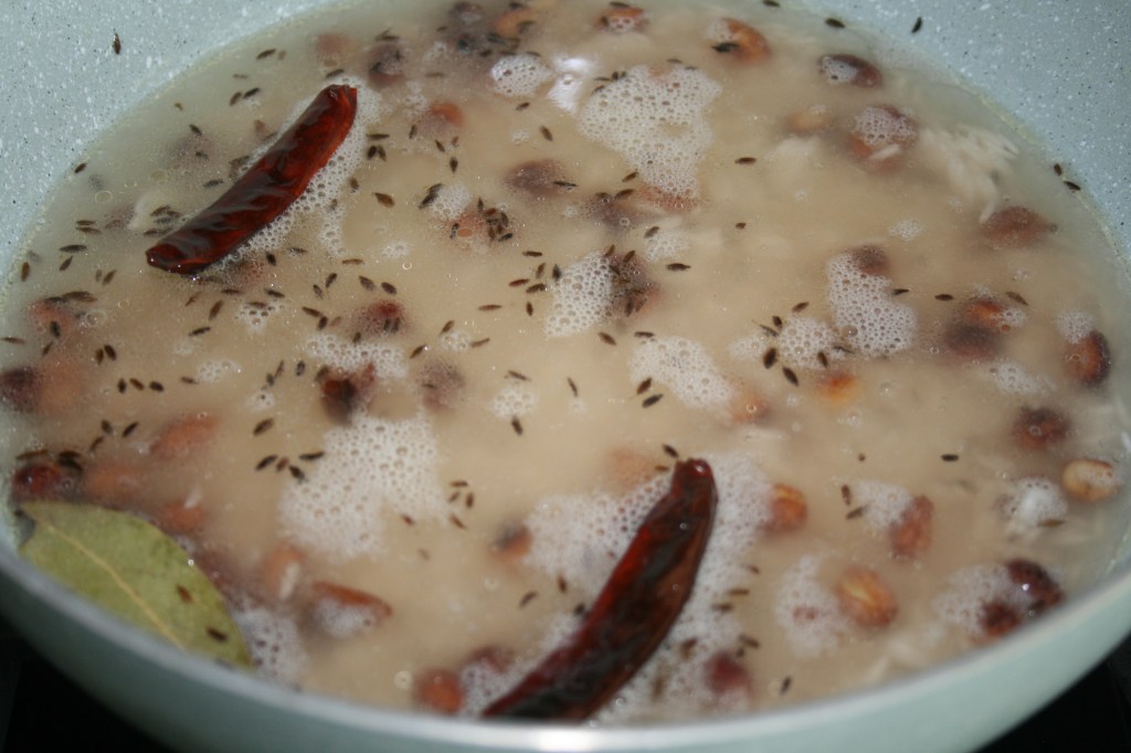 - In about two tablespoons of vegetable oil, heat up the cumin seeds, red chilies (whole), and peanuts.