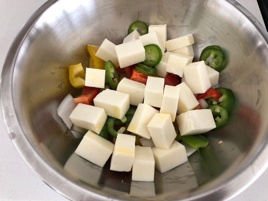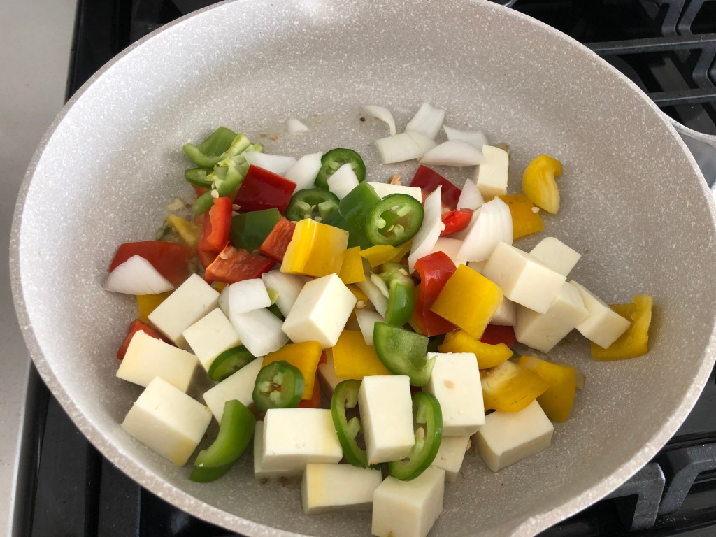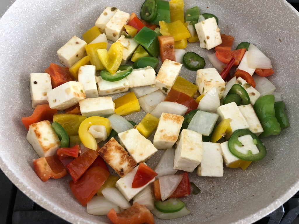 - After a minute, add in the paneer and veggies. Cook until the paneer starts to brown.