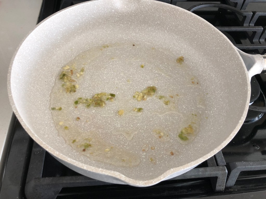 - In a large pan, heat up some vegetable oil and add in the chopped thai chili and garlic cloves.