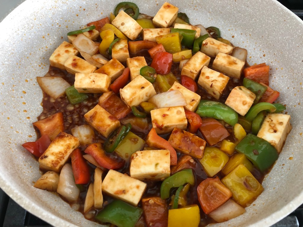 - Add in the sauce and mix until all the veggies and paneer are coated. Continue to cook the mixture until the sauce has thickened and coated the veggies.