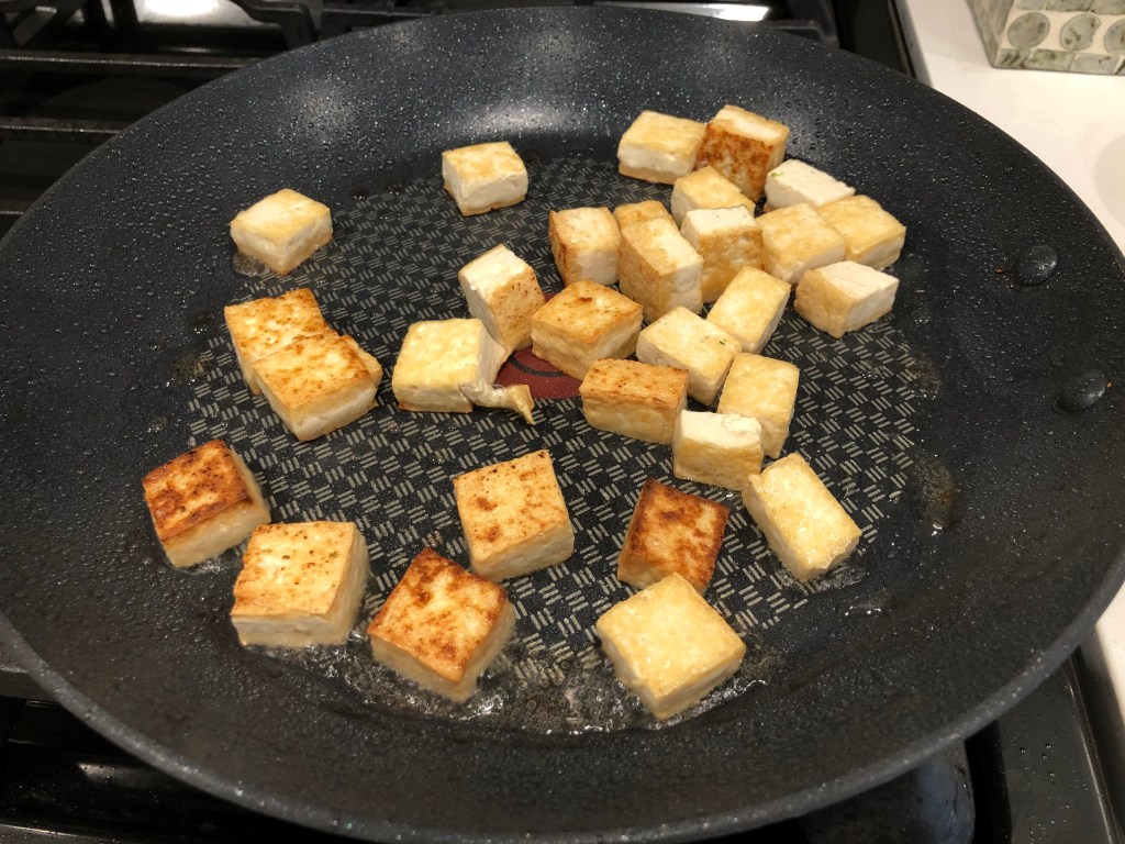 - Press the tofu in between some paper towels and dry it off as much as possible. Then cut into cubes and cook in a non stick pan with a little vegetable oil until all the sides are browned. Set aside.