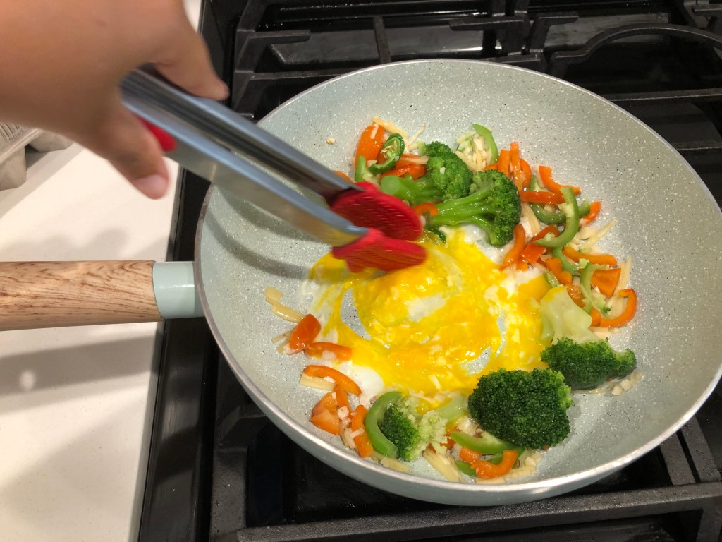 - As soon as the white part of the egg even starts to cook, break up the egg with your spoon or tongs.