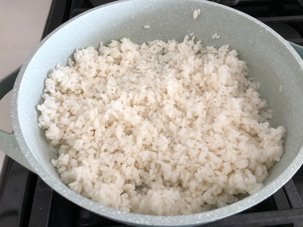 - Cook the sushi rice according to the package instructions. Once it has cooled for 10 min, drizzle in the rice vinegar and lightly mix the rice with a fork. Let it cool completely.