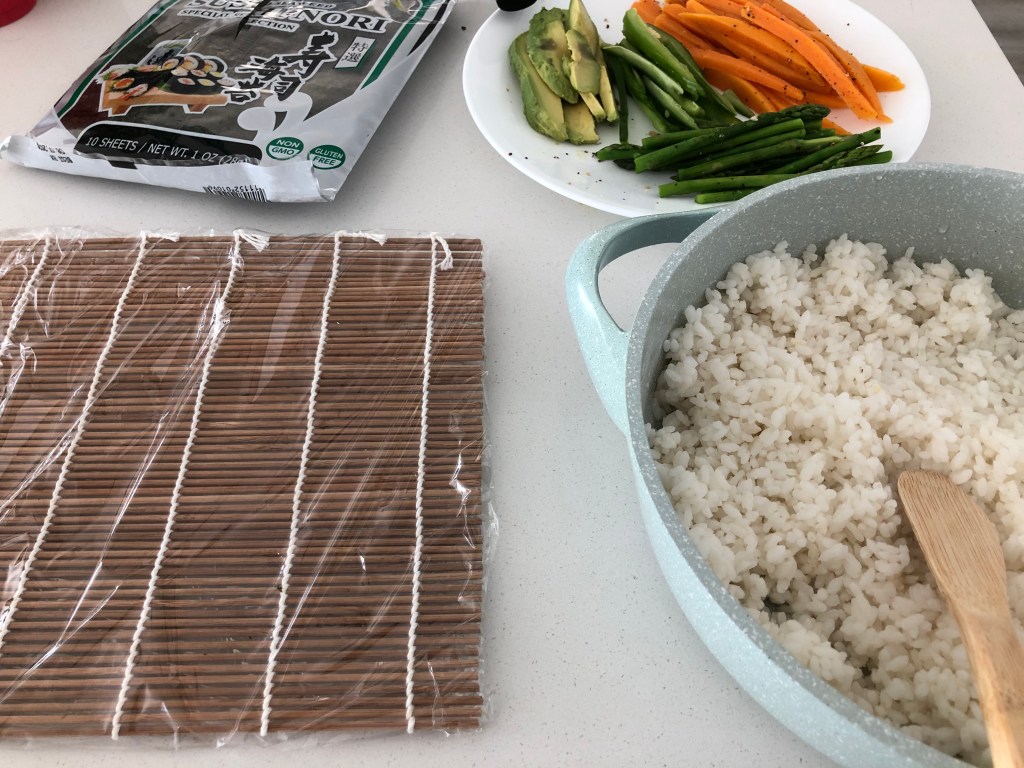- Cover the sushi mat with plastic wrap all the way around (this will make your life WAY easier). Lay the mat so it will be rolling away from you.