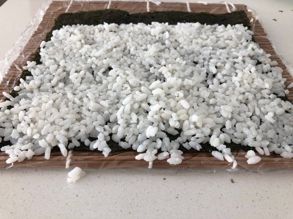 - Start with one piece of nori on your mat, and spread an even layer of rice on it. Try to keep the rice layer as thin as possible without leaving much of the nori sheet exposed.