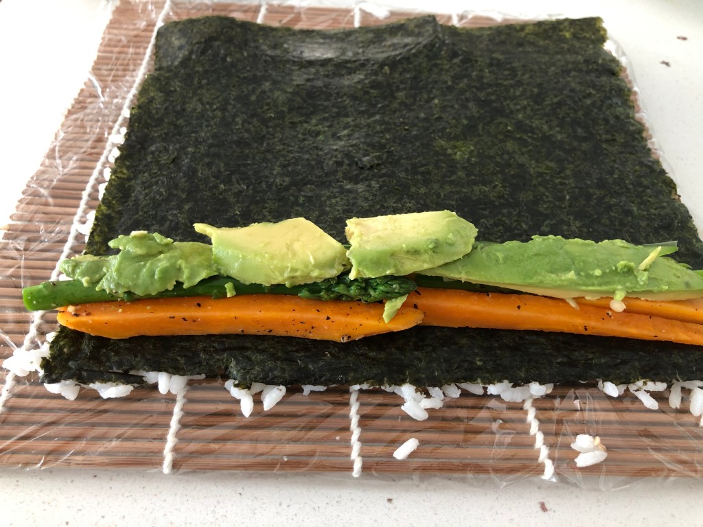 - Layer your fillings in a line along the edge of the nori. Make sure to go all the way to the ends so you don’t waste any of the roll.