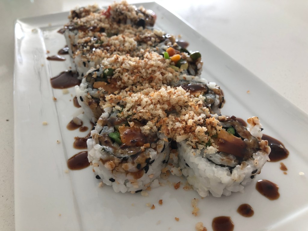 I have really been missing going out for sushi during this quarantine. Of course for the food, but also for the company and sake bombs. Vegetarians usually only have avocado rolls as an option at most places, so I created a veggie roll that has some crunch, a sweet and salty sauce, and makes for a great packed lunch for when we go back to the office.