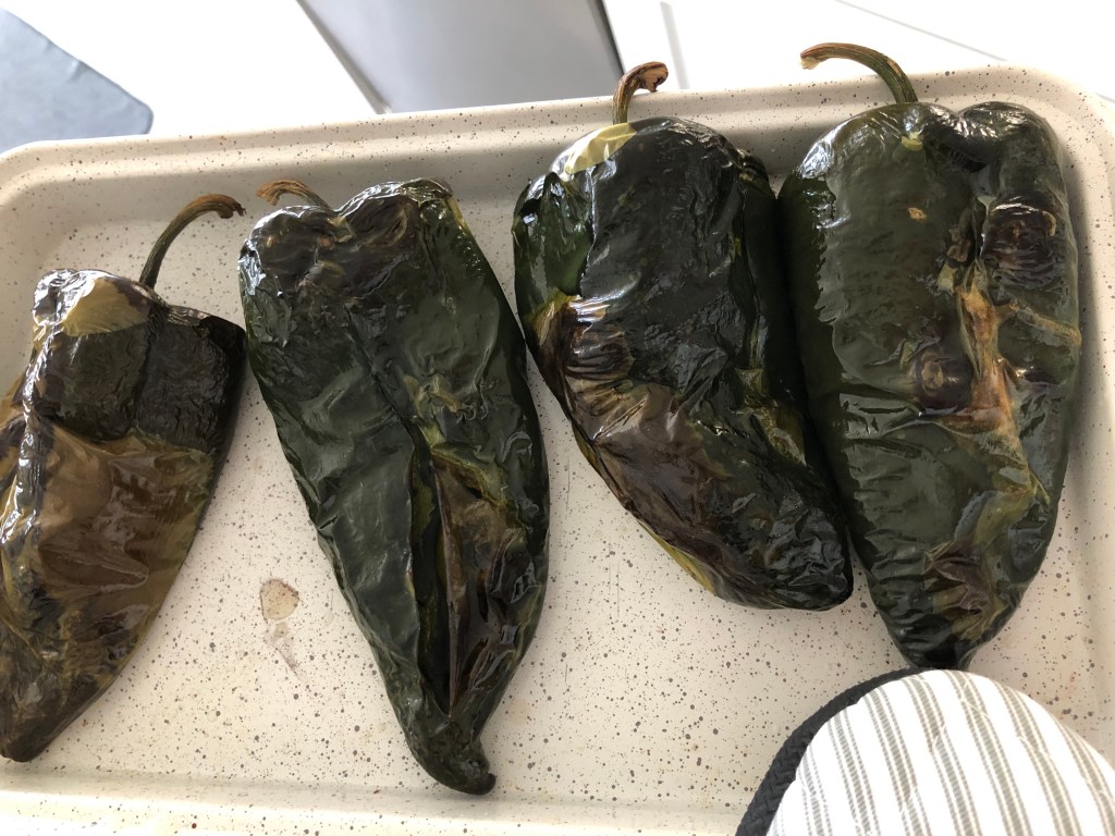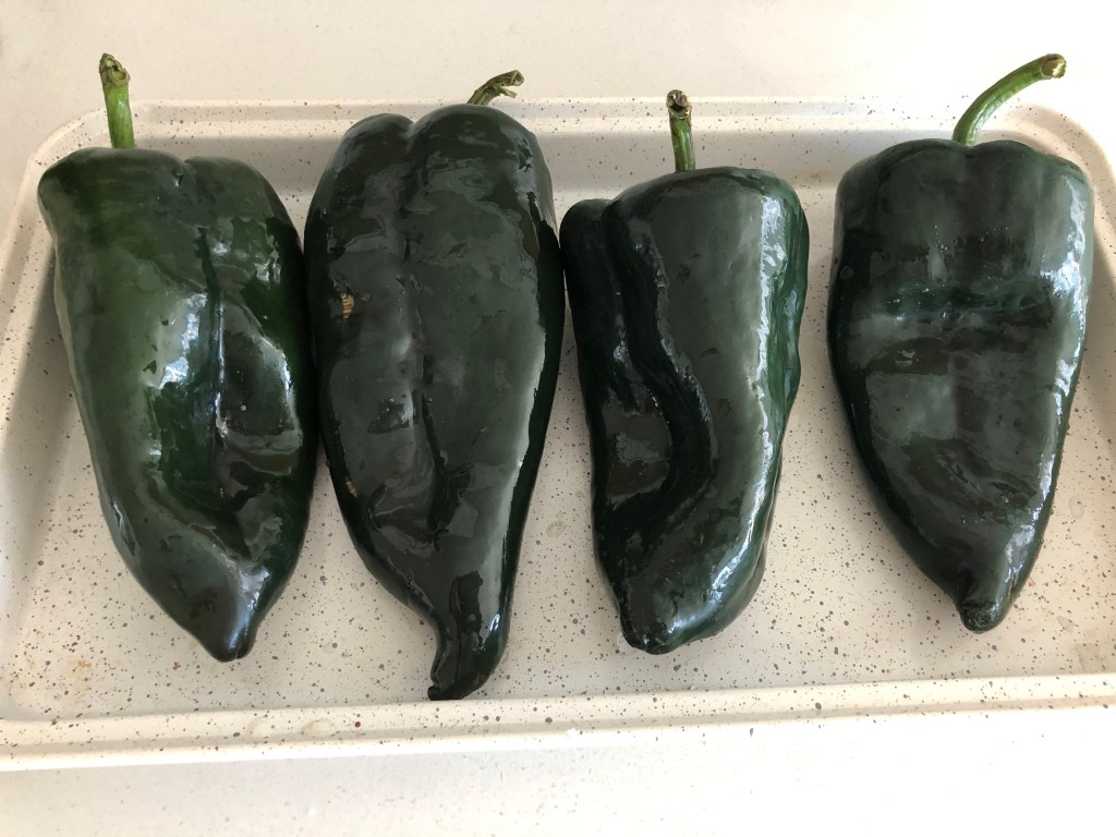 - Rub some vegetable oil on the poblanos and bake them for about 20- 25 minutes. Until they are soft and some of the skin has charred. Flip them over halfway through.