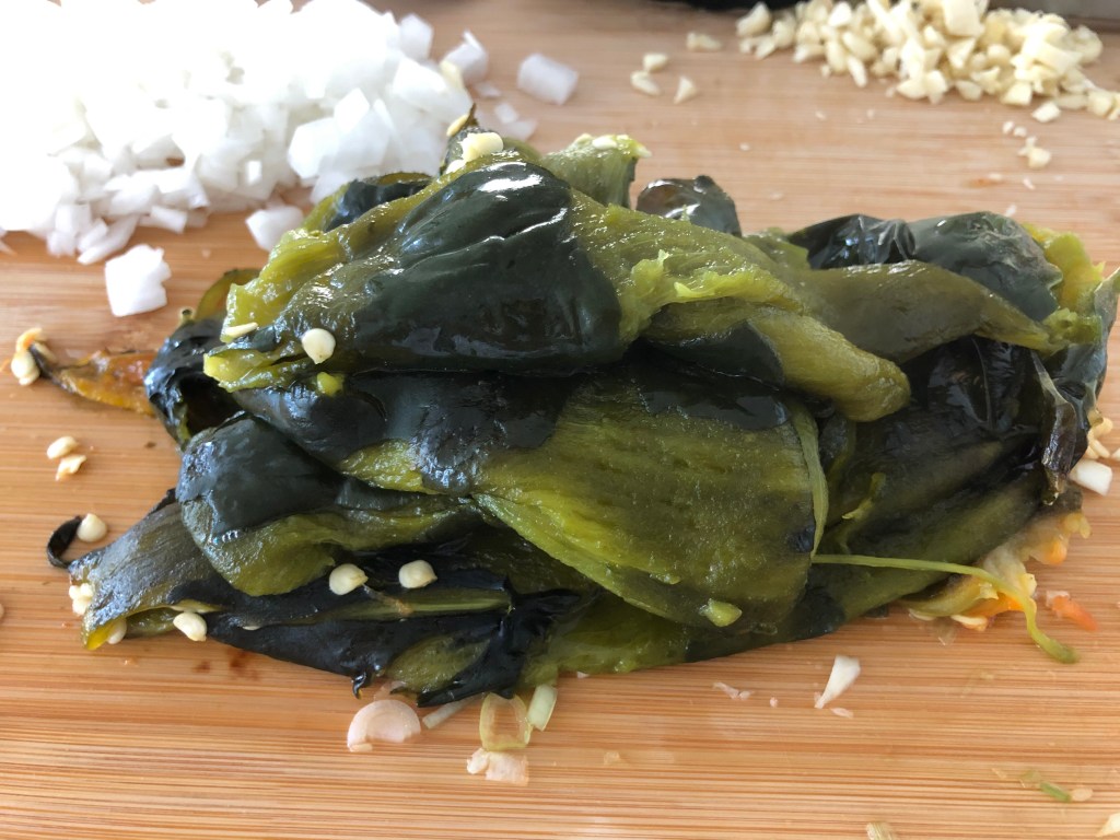- Place the poblanos in a bowl and cover with a towel for about 10 minutes. Once they are cool enough to touch, slowly peel off the skin. Don’t worry about getting all of it, just whatever comes off easily.