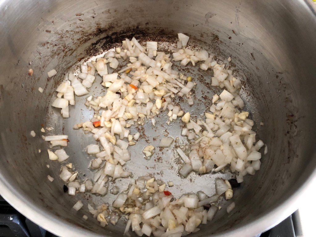 - In a pan over medium heat, cook the onions and garlic in some olive oil until the onions are softened.