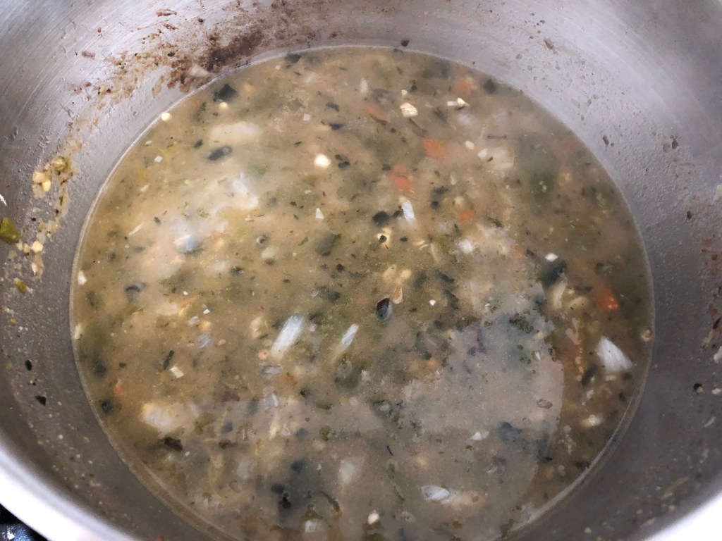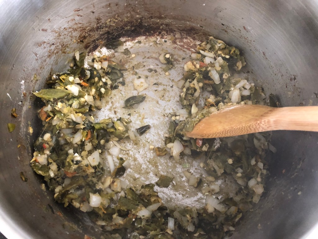 - Add in the poblanos, chopped serrano, and salt and pepper.