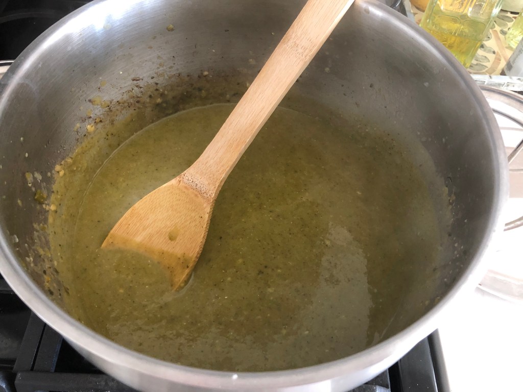 I love this sauce on everything, but it makes an especially good enchilada or chilaquiles sauce. Since it doesn’t have tomatoes in it, it is not tart at all and has a really savory flavor. You can make it as spicy or mild as you like with the addition of serranos (for me, the spicier the better).