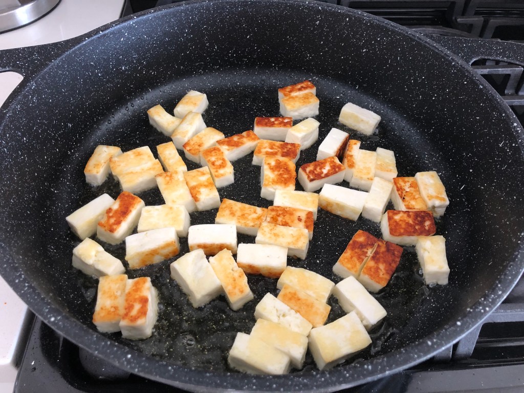 - Once hot, add the paneer cubes and cook until they are brown on all sides.