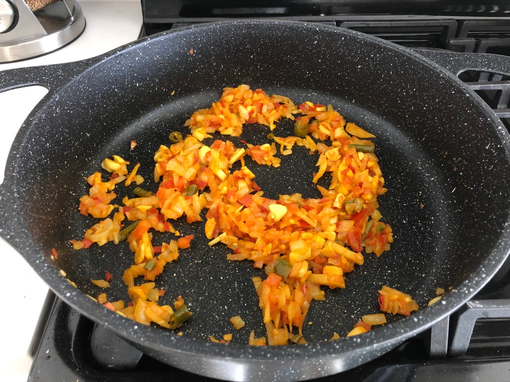 - Add a little olive oil to the pan, and add in the onions, tomatoes, garlic, ginger, and thai chillies.