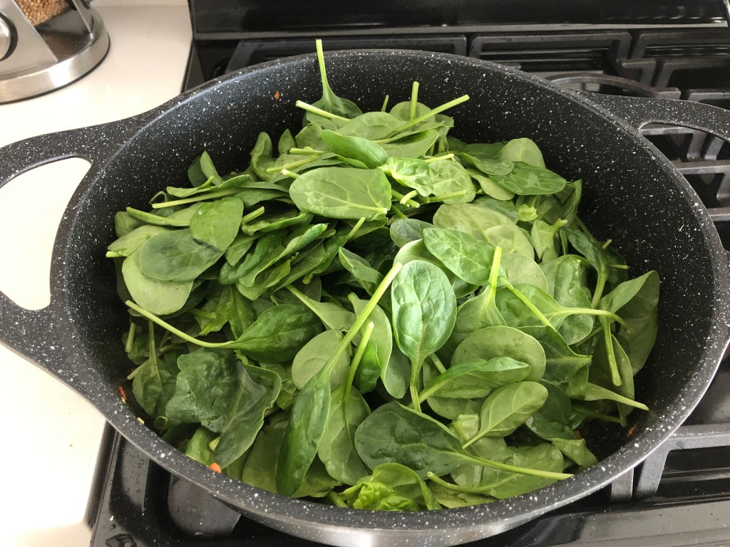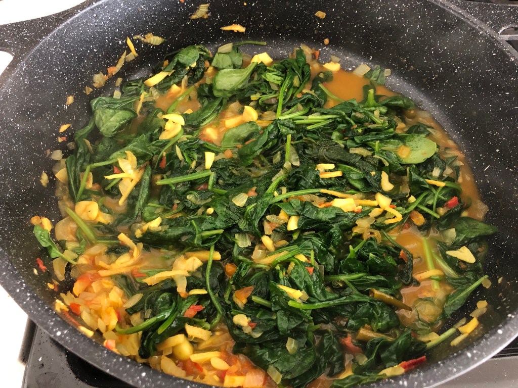 - After the spinach has wilted a little, add a little bit of water and mix everything until the spinach has all completely wilted.