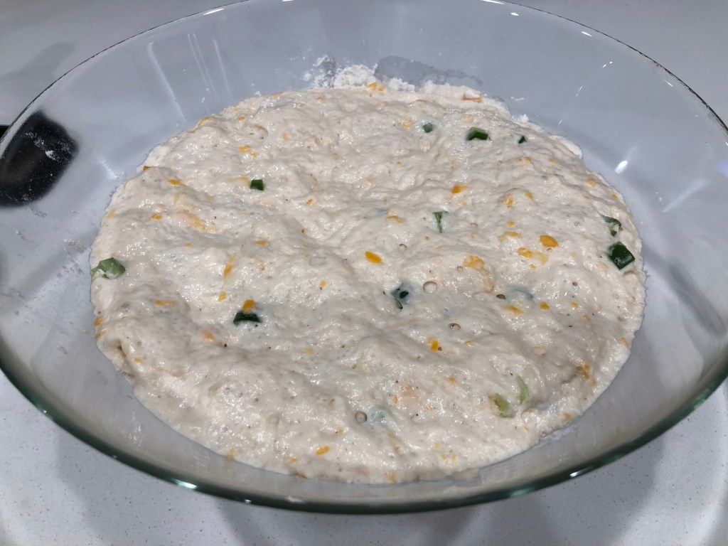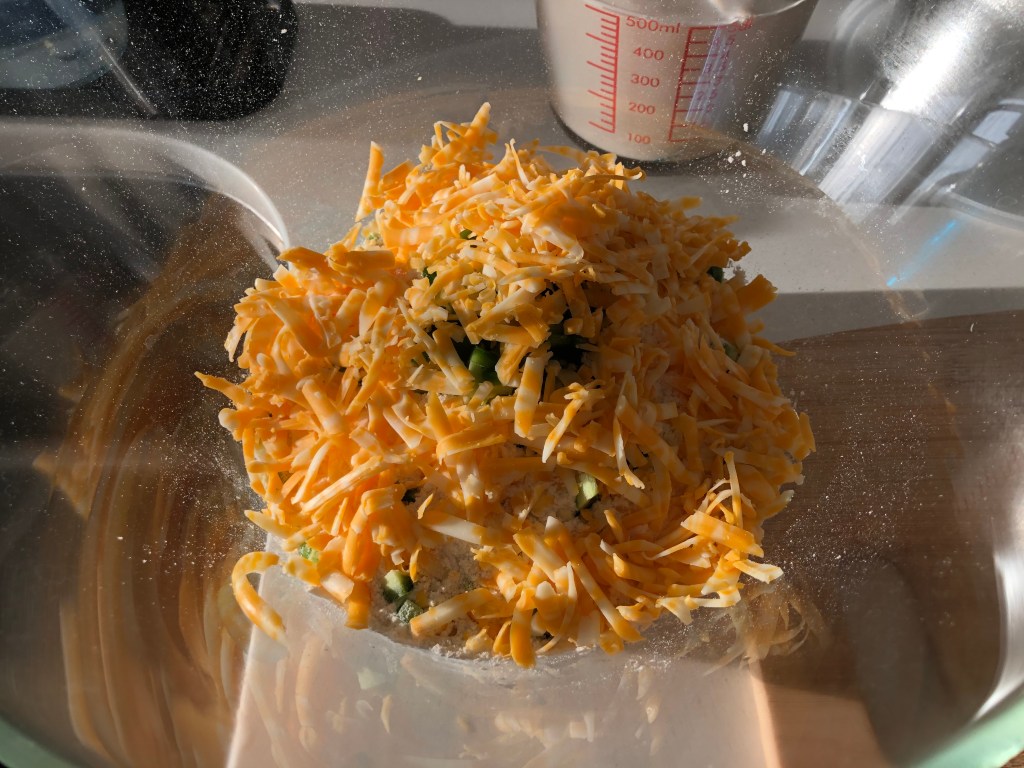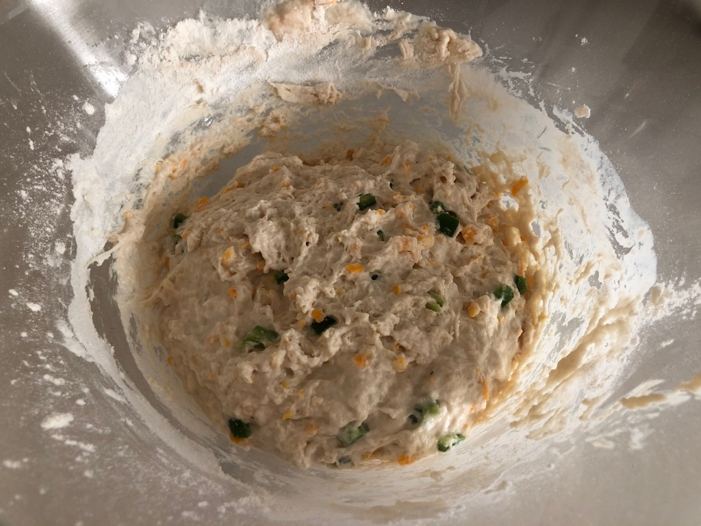- In a large bowl, combine the cheese, jalepeno, and bread flour.