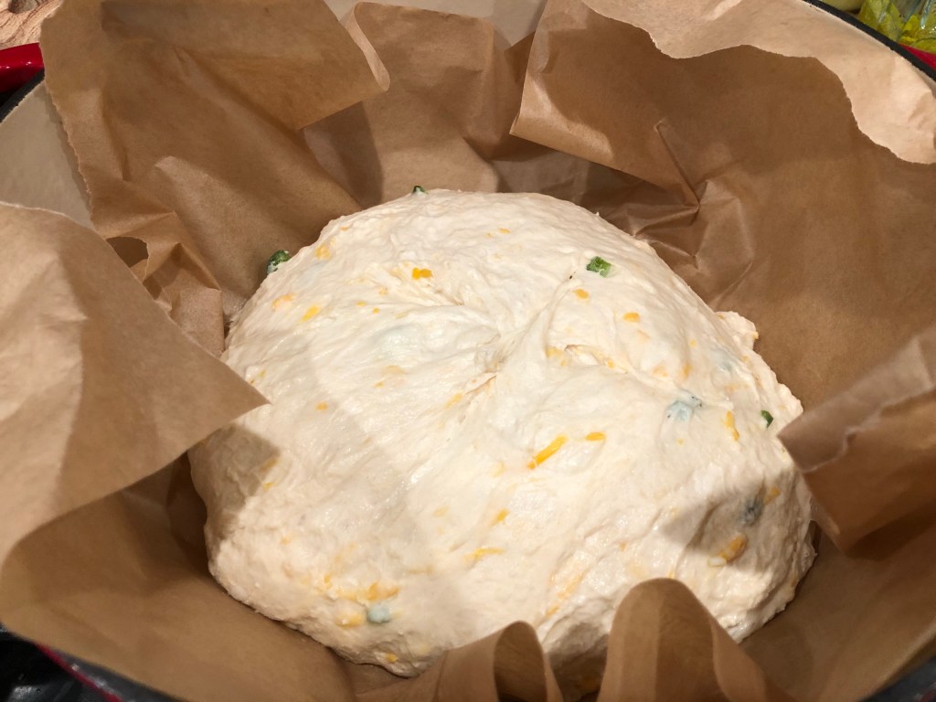 - Take your dutch oven out of the oven and place your dough inside *carefully*. Cover with the lid and put back in the oven for 30 min.